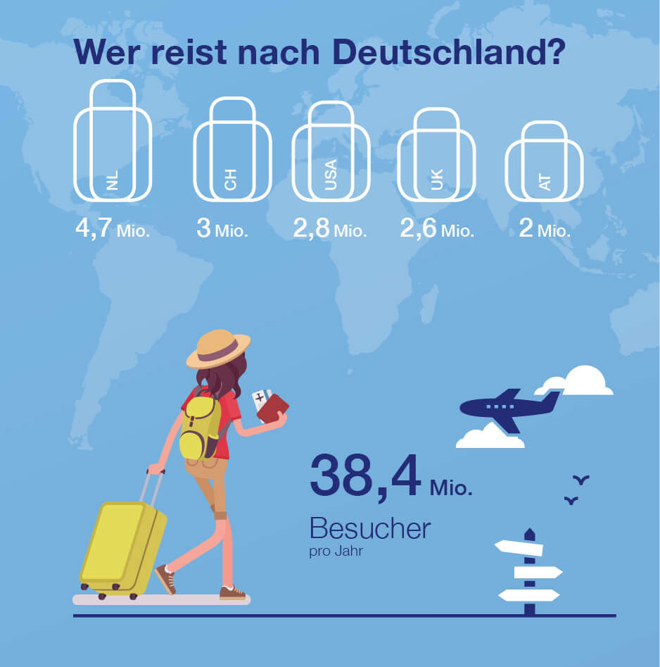 Insgesamt hat Deutschland 38,4 Mio. Besucher aus dem Ausland. Auf den vorderen Plätzen liegen unsere Nachbarländer wie Holland (4,7 Mio.), Schweiz (3 Mio.), Großbritannien (2,6 Mio.) oder Österreich (2 Mio.). Doch auch Länder wie die USA sind gut vertreten (2,8 Mio.).